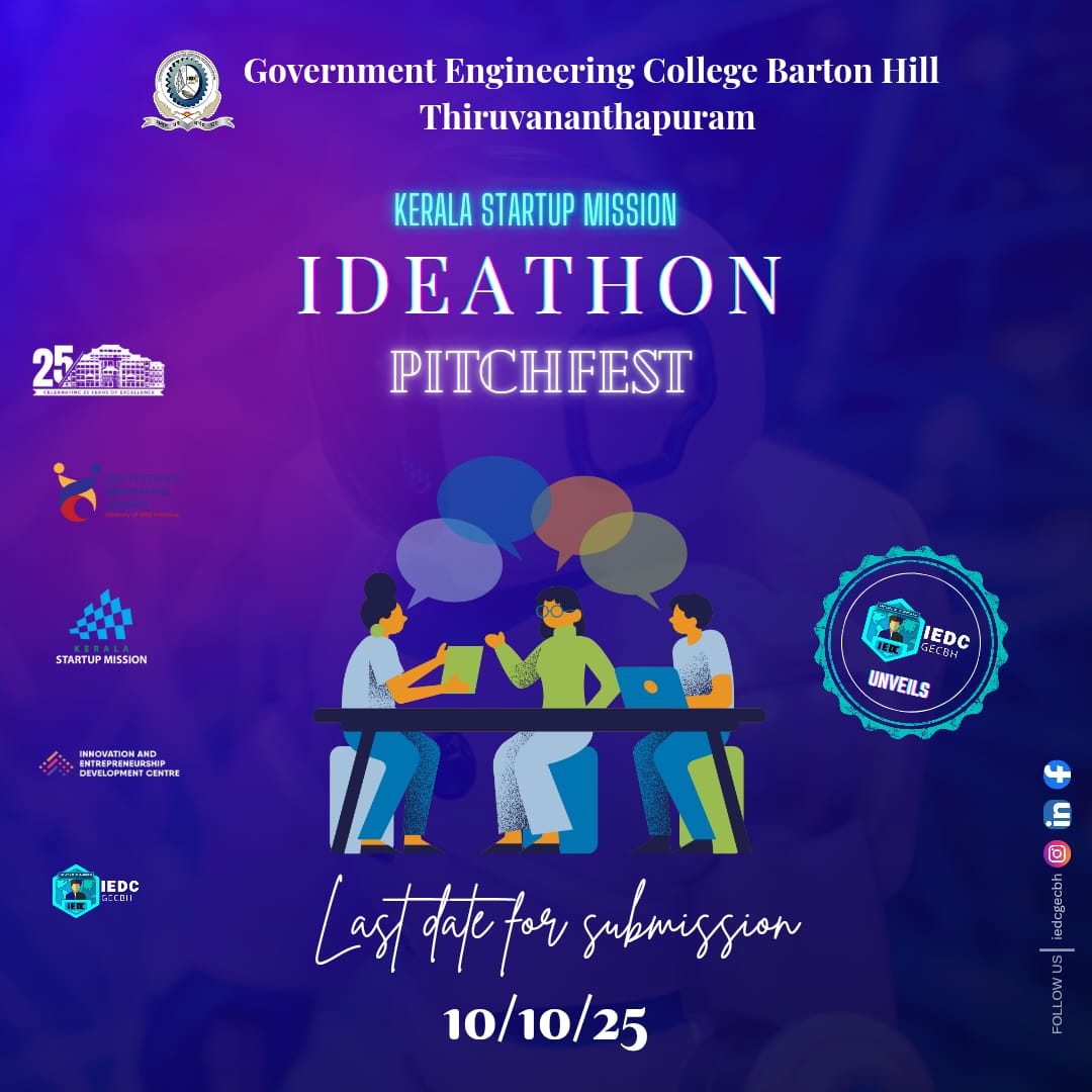 IEDC Ideathon 2025 was organized to identify and promote innovative ideas in Electronics and Technology, serving as the college-level qualifier for the Statewide Pitchfest Series. Over 25 teams registered, and 5 shortlisted teams presented their ideas in an online pitching session. Top teams were selected to represent GEC Barton Hill at the State-Level Pitchfest and will receive mentorship support. The event effectively encouraged entrepreneurship and creativity among students, contributing to the Kerala Startup Mission’s goal of fostering innovation-driven startups.