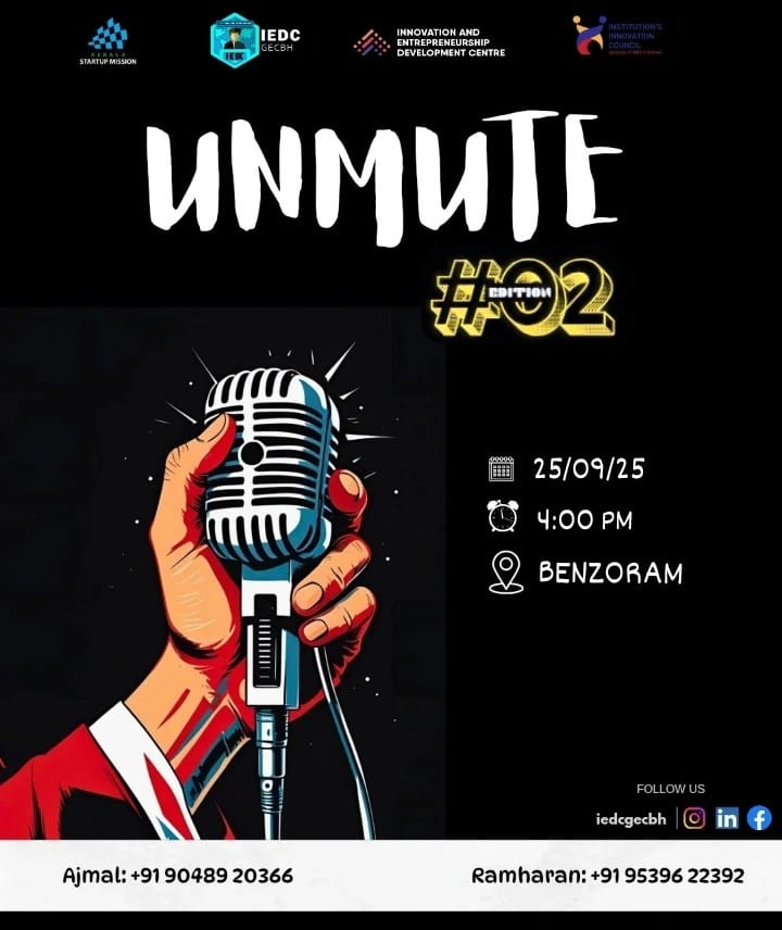 As part of leadership and innovation skill-building, IEDC facilitated “Unmute,” a group discussion event designed to enhance students’ communication, critical thinking, and problem-solving abilities. This platform encouraged students to express their views on innovation-driven themes, thereby nurturing confidence and collaboration. In summary, the year 2024–25 has been a period of meaningful progress and renewed purpose for IEDC GEC Barton Hill. With continued enthusiasm and collective effort, we look forward to scaling greater heights in innovation and entrepreneurship in the years ahead. Thank you.